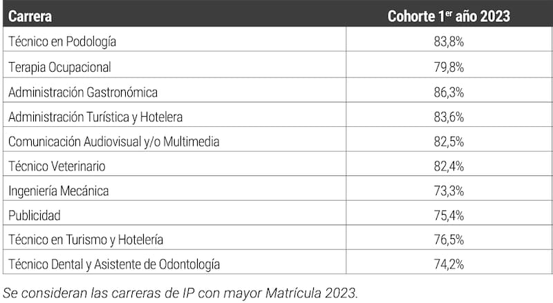 En Institutos Profesionales (IP): Las carreras con mayor aprobación son Técnico en Podología (90%), Terapia Ocupacional (89%) e Ingeniería en Seguridad Privada (88%).