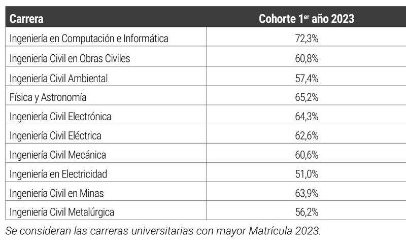 En universidades: Las ingenierías civiles presentan los mayores desafíos. Lidera la lista Ingeniería Civil en Computación e Informática (73%), seguida por Ingeniería Civil en Obras Civiles (61%) e Ingeniería Civil Ambiental (57%).