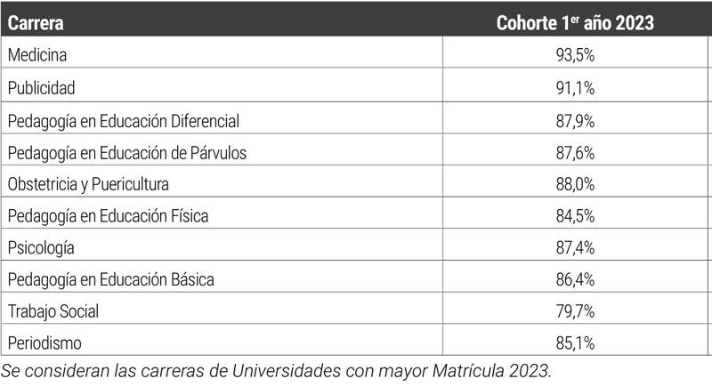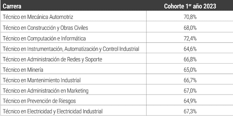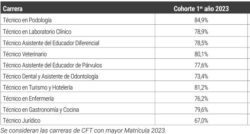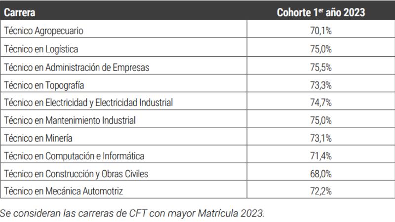 En Centros de Formación Técnica (CFT): Las tasas más bajas corresponden a Técnico Agropecuario (70%), Técnico en Logística (75%) y Técnico en Administración de Empresas (76%).