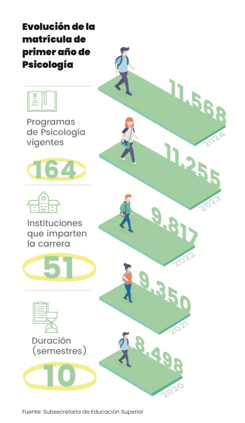 Un informe de la Subsecretaría de Educación Superior muestra que a nivel de carreras universitarias “las que presentan mayor matrícula de primer año 2024 son Psicología (11.568), Derecho (10.176), Ingeniería Comercial (9.418) y Enfermería (7.466)”. A la fecha, según los registros del Mineduc, se imparten a nivel nacional 164 programas de Psicología en 51 casas de estudio.