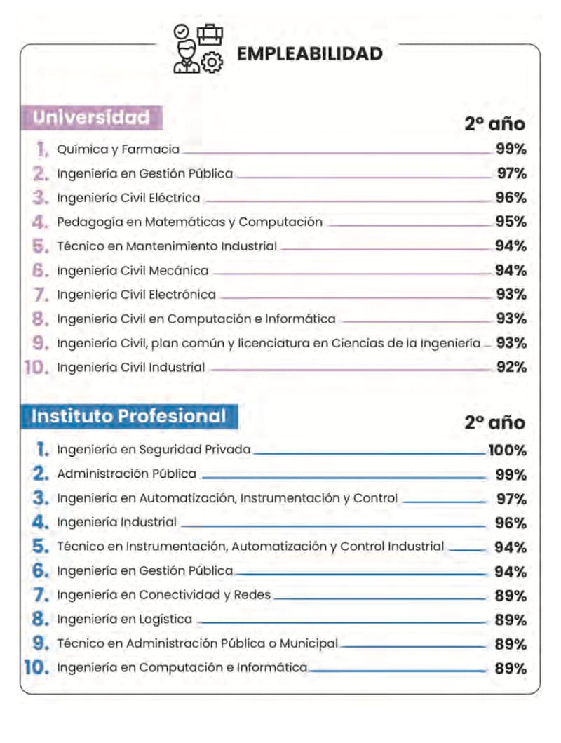Administración Pública, con un 99%, también destaca entre las carreras técnicas. Según Walter Luchsinger, subdirector de la Escuela de Administración y Negocios de Duoc UC, “la modernización de los procesos estatales ha generado una alta demanda de técnicos capacitados para responder a los desafíos de eficiencia y transparencia”.