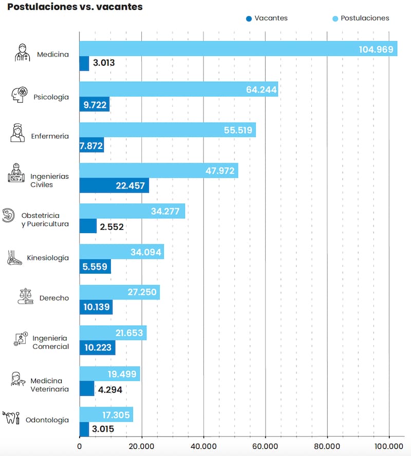 En 2024, 105 mil alumnos soñaban con ingresar a Medicina, pero solo 3 mil lo lograron. Pero no es la única licenciatura que dejó heridos en el camino: Psicología, Enfermería, Ingenierías Civiles, Obstetricia, Kinesiología, Derecho, Ingeniería Comercial, Veterinaria y Odontología completan el listado de las 10 carreras con mayor demanda.