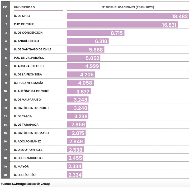 En el periodo 2019-2023, la Universidad de Chile y la Pontificia Universidad Católica de Chile destacan con outputs acumulados de 18.482 y 16.831 publicaciones, respectivamente. En términos de fortalezas investigativas, ambas universidades tienen perfiles de investigación diversos, pero con enfoques específicos que las diferencian.