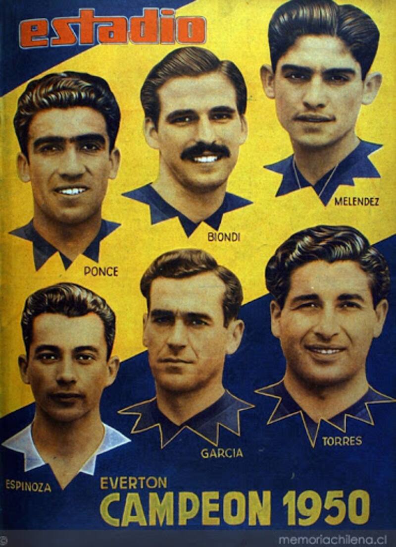 1951: Everton alcanza su primera corona de Primera División al titularse campeón del torneo 1950. Los ruleteros derrotan 1-0 a Unión Española en partido de definición, luego de que ambos igualaran con 30 puntos cada uno en el primer lugar. René Meléndez anota la cifra a los 104′ ante 42.551 espectadores, en el Estadio Nacional.