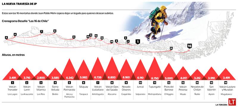 Luego de la aventura por el Tronador, “Los 16 de Chile” seguirá su curso este miércoles con el volcán Parinacota, en la región de Arica y Parinacota. Un viaje que irá de cumbre en cumbre (ver infografía), de norte a sur, durante los próximos dos meses. Tras eso, otro desafío aguarda.