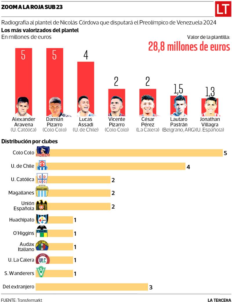 De lo general a lo particular. En el contingente de Córdova son dos los futbolistas que sobresalen por su valorización. Alexander Aravena y Damián Pizarro son los más costosos de Chile, cotizados en 5 millones de euros cada uno, según Transfermarkt. Mientras el Monito es la carta más exportable que tiene Católica en el futuro próximo, el ariete albo tendrá, luego del Preolímpico, la opción de llegar a Udine para sellar el vínculo con el elenco italiano. El podio de los más valorizados lo cierra Lucas Assadi, con 4 millones de la moneda europea. En la U aguardan porque el 2024 sea el año de su consolidación.