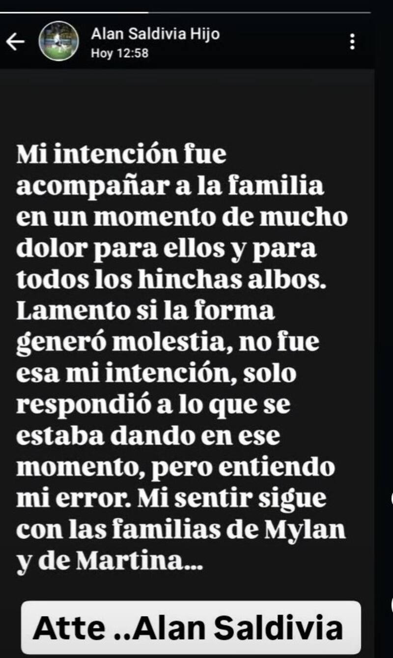 Saldivia está arrepentido. De hecho, publicó un mensaje en el que intenta explicar la situación y ofrecer las respectivas disculpas. Eso sí, elige una plataforma que no es necesariamente pública: su cuenta en WhatsApp. Una historia en esa plataforma da cuenta de que ahora actuaría en forma distinta.