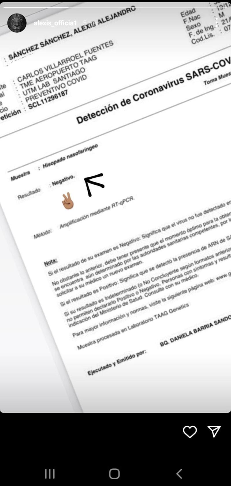 Pese a la inquietud, por ahora respiran tranquilos en Juan Pinto Durán, ya que tanto Alexis Sánchez como Arturo Vidal dieron negativo en los exámenes que se realizaron al salir de Italia y al ingresar a Chile. De hecho, horas después de la noticia de Martínez, el goleador histórico de la Roja subió una historia a su Instagram exponiendo el resultado de un PCR.