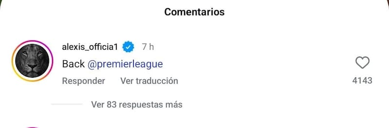 Fue en una publicación del Arsenal, donde postearon uno de los goles del nortino con los Gunners y escribieron “Alexis en su mejor momento”, a lo que el chileno no dudó en responder: “Volver, Premier League”.