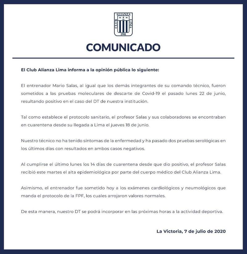 También se agrega que Salas es asintomático y que pasó dos pruebas serológicas en los últimos días que arrojaron resultado negativo. “Al cumplirse el último lunes los 14 días de cuarentena desde que dio positivo, el profesor Salas recibió este martes el alta epidemiológica por parte del cuerpo médico del Club Alianza Lima. Asimismo, el entrenador fue sometido hoy a los exámenes cardiológicos y neumológicos que manda el protocolo de la FPF, los cuales arrojaron valores normales”, añade el comunicado.