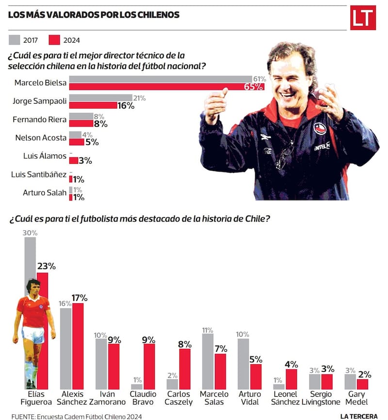 Esta inclinación por lo “actual” contrasta con la elección de Elías Figueroa como el mejor jugador chileno de todos los tiempos. El exzaguero se mantiene en el primer lugar, pero baja siete puntos (de 30 a 23%). Lo sigue Alexis Sánchez (que sube una unidad de 16 a 17%) y tercero aparece Iván Zamorano (que baja de 10 a 9% en su porcentaje de votos). Bam Bam, además, está igualado con Claudio Bravo. Mucho más atrás está Arturo Vidal, un nombre que ha generado debate en el último tiempo. Arriba del volante que firmó en Colo Colo durante los últimos días aparecen Carlos Caszely y Marcelo Salas.
