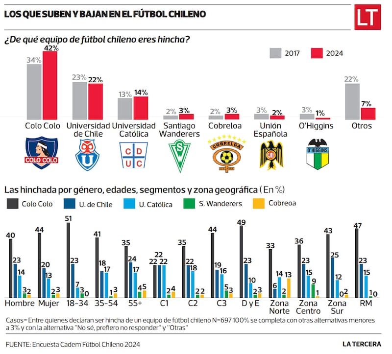 Sin embargo, si un elemento llama la atención en el caso de la franja es la edad de sus hinchas. Los albos concentran la mayoría de ellos entre 18 y 34 años, un 51% del segmento, mientras Universidad Católica solo posee un 7%. Por otra parte, en lo socioeconómico se rompen ciertas barreras. En el sector C1 existe una llamativa igualdad de 22% de hinchas de los denominados tres grandes; luego, en el C2, la institución de Macul saca ventaja, una tónica que se mantiene en el resto de los sectores. “Hace años que se rompieron las brechas. Por ejemplo, Colo Colo es un equipo que se identifica con lo popular, pero los tres grandes han ido generando una mayor transversalidad en la sociedad”, señala Rodrigo Figueroa, académico del Departamento de Sociología de la Universidad de Chile. Algo que se refrenda en la participación de las universidades en los segmentos medios a bajos. Mientras la U tiene 19% de hinchas en el C3 y un 22% en los segmentos D y E, la UC tiene un 16% en C3 (por sobre su promedio de 14% nacional) y un 10% en D y E.