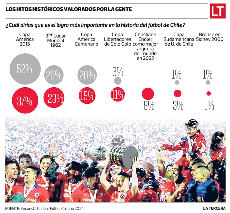 Hace ocho años, los chilenos se volcaban a las calles cuando Alexis Sánchez anotaba un penal contra Argentina y la Roja conquistaba su primera Copa América. Era una victoria inédita. Un recuerdo muy fresco cuando se realizó la anterior encuesta Cadem relacionada al fútbol. En aquel momento, un 52% de los consultados la eligió como el hito más importante de la historia de la Selección. Hoy la cifra desciende a un 37%. Aun así, se mantiene en el primer lugar. En un segundo puesto está el tercer lugar del Mundial de 1962 (que subió de un 20 a un 23% en las preferencias).