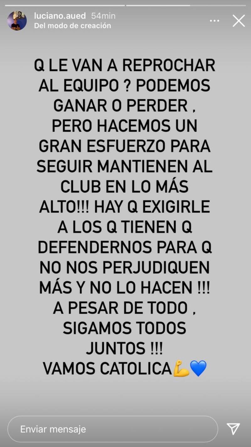 Otro que reaccionó, pero en redes sociales, fue Luciano Aued. El mediocampista se mostró molesto, dejando entrever en un mensaje que sus dardos apuntan a quienes los “defienden”.
