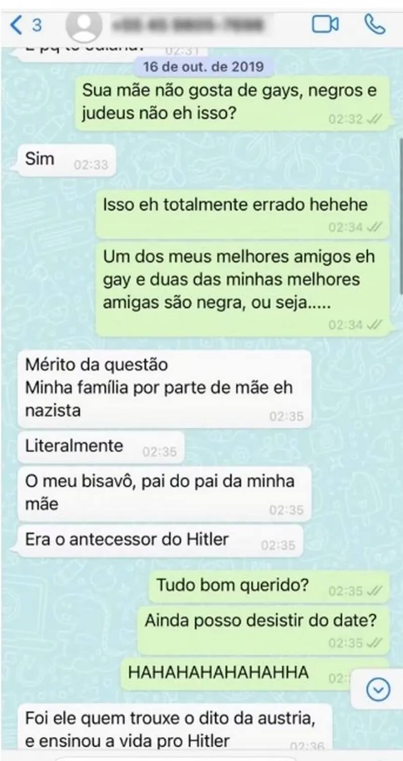Thayane Lima, la expareja de Seyboth Wild, le decía: “A tu madre no le gustan los gays, los negros ni los judíos ¿no?”. Ahí es cuando viene la respuesta que ha sorprendido al mundo. “La familia de mi madre era nazi. Mi bisabuelo fue el antecesor de Hitler. Él fue quien sacó a Hitler de Austria y le enseñó el mundo”, afirmaba el tenista. En la captura de WhatsApp, se incluye una fotografía de quien sería el ascendiente del deportista, pero la baja calidad de la imagen no deja en claro de quien se trataría.