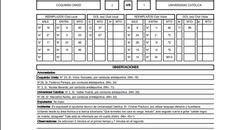 La incidencia es detallada así por el juez. “Es expulsado el ayudante técnico de Universidad Católica, Sr. Cristian Paulucci, por utilizar lenguaje ofensivo y humillante. Gritando desde su área técnica a la banca adversaria ‘Que te metes vos cara de verga, boludo’, acto seguido vuelve a gritar ‘callate negro de mierda, alcaguete’ Todo esto es informado por mi cuarto árbitro. (Min. 45+1)”, detalla el documento.