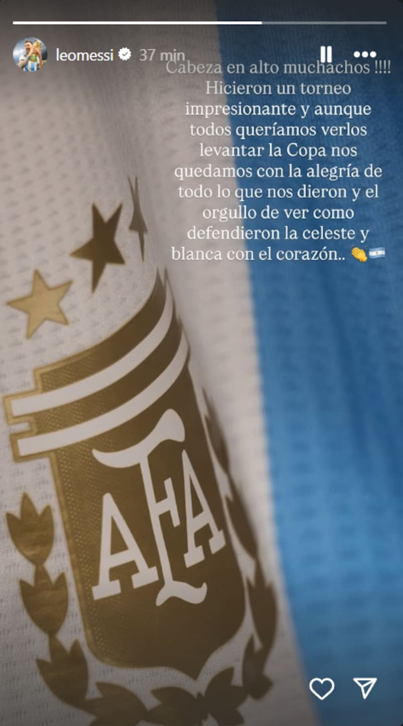 “Hicieron un torneo impresionante y aunque todos queríamos verlos levantar la Copa nos quedamos con la alegría de todo los que nos dieron y el orgullo de ver cómo defendiendo la celeste y blanca con el corazón”, añade, con la camiseta albiceleste que llevó a lo más alto en el Mundial de Qatar de 2022 como telón de fondo.