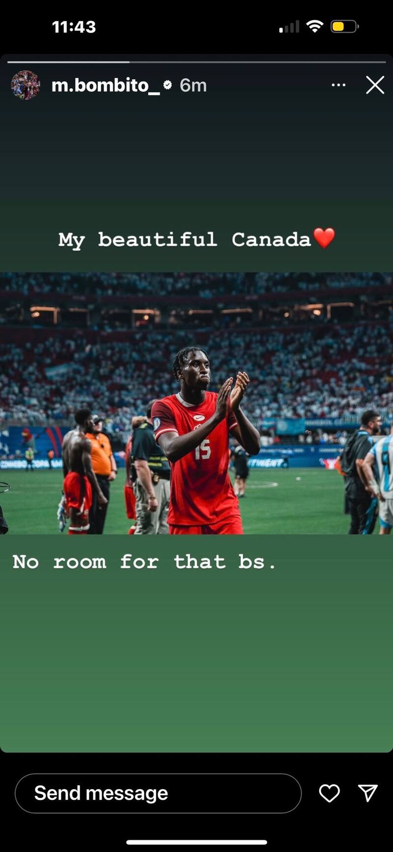 Tras ello, el central afectado realizó una publicación en su cuenta de Instagram: “Mi hermosa Canadá. No hay lugar para esa mierda”, compartió el futbolista a través de las historias de la aplicación.