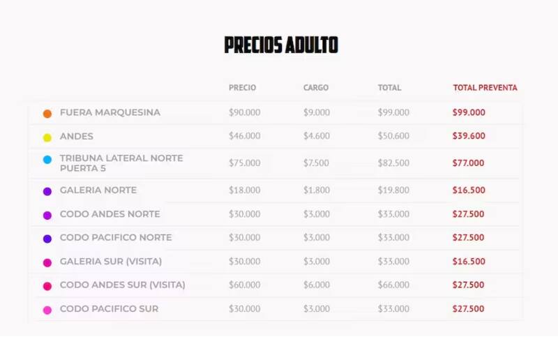 Los precios en el caso de los sectores pensados para la fanaticada forastera son más elevados que los pensados para los seguidores de la selección chilena. La galería norte cuesta $19.800 para hinchas locales, mientras que los venezolanos tendrán que desembolsar $33.000 por el mismo asiento. En el caso del codo andes, los chilenos deben pagar $33.000 para dicha ubicación, monto que aumenta a $66.000 para la visita. Sin embargo, esto no fue un problema para los forofos de la Vinotinto, que rápidamente agotaron los cupos puestos a disposición en la preventa. Pese a tratarse de dos sectores del estadio completos para los hinchas visitantes, desde Quilín aseguran que son solo 2.900 localidades.