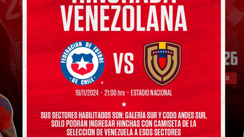 Este miércoles comenzó la preventa de las entradas para el duelo entre la Roja y Venezuela, que se jugará en el Estadio Nacional. Los precios van desde los 27 mil 500 pesos hasta los 99 mil. Sin embargo, la mayor sorpresa radica en que la ANFP decidió otorgar todo el sector de la galería sur y el codo andes sur a los fanáticos visitantes. “Solo podrán ingresar hinchas con camiseta de la selección de Venezuela a esos sectores”, informaron en un afiche publicado en PuntoTicket, la plataforma donde se pueden conseguir los boletos.