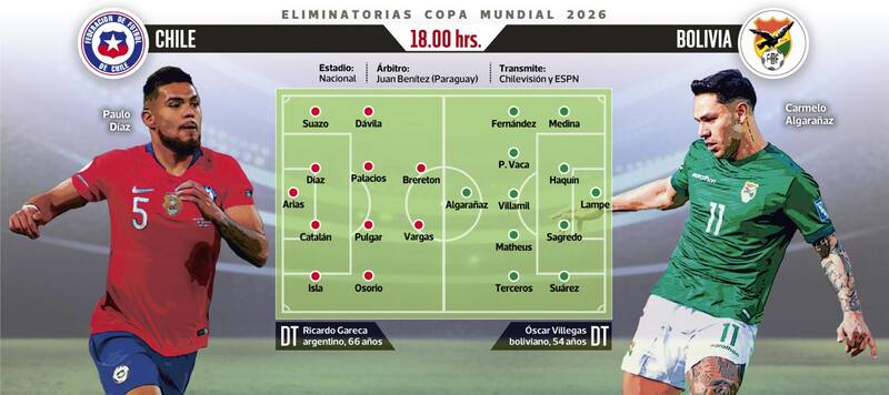 Gareca sabe que la Roja está obligada al protagonismo. Primero, por la necesidad de puntos y, luego, para satisfacer las exigencias de los hinchas que llegarán a Ñuñoa. En ese contexto, la fórmula que ha preparado es distinta a la que plantó en el Monumental de River Plate y a la que históricamente ha utilizado. En la defensa, por ejemplo, Gabriel Suazo volverá a la banda izquierda, aunque los principales movimientos estarán en la mitad y en el ataque: el último ensayo consideró a Erick Pulgar y Carlos Palacios. Eduardo Vargas seguirá comandando el ataque, pero esta vez junto a Ben Brereton. ¿El damnificado? Vicente Pizarro, quien el domingo había entrenado entre los titulares. La señal está clara: el Tigre advierte que el problema está en la generación de juego, pero también en la pegada. Hace siete partidos oficiales que Chile no hace un gol. La duda está en el arco: Gabriel Arias o Brayan Cortés. Lo más probable es que le reitere la confianza al de Racing.