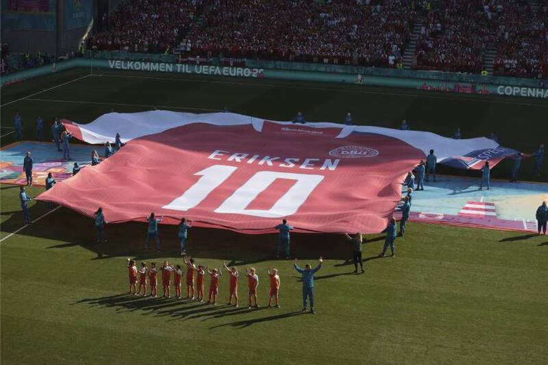 Además, en la salida de los equipos, se desplegaron dos camisetas gigantes, una de ellas, la de Dinamarca, estaba personalizada con el número 10 y con el apellido de Eriksen.