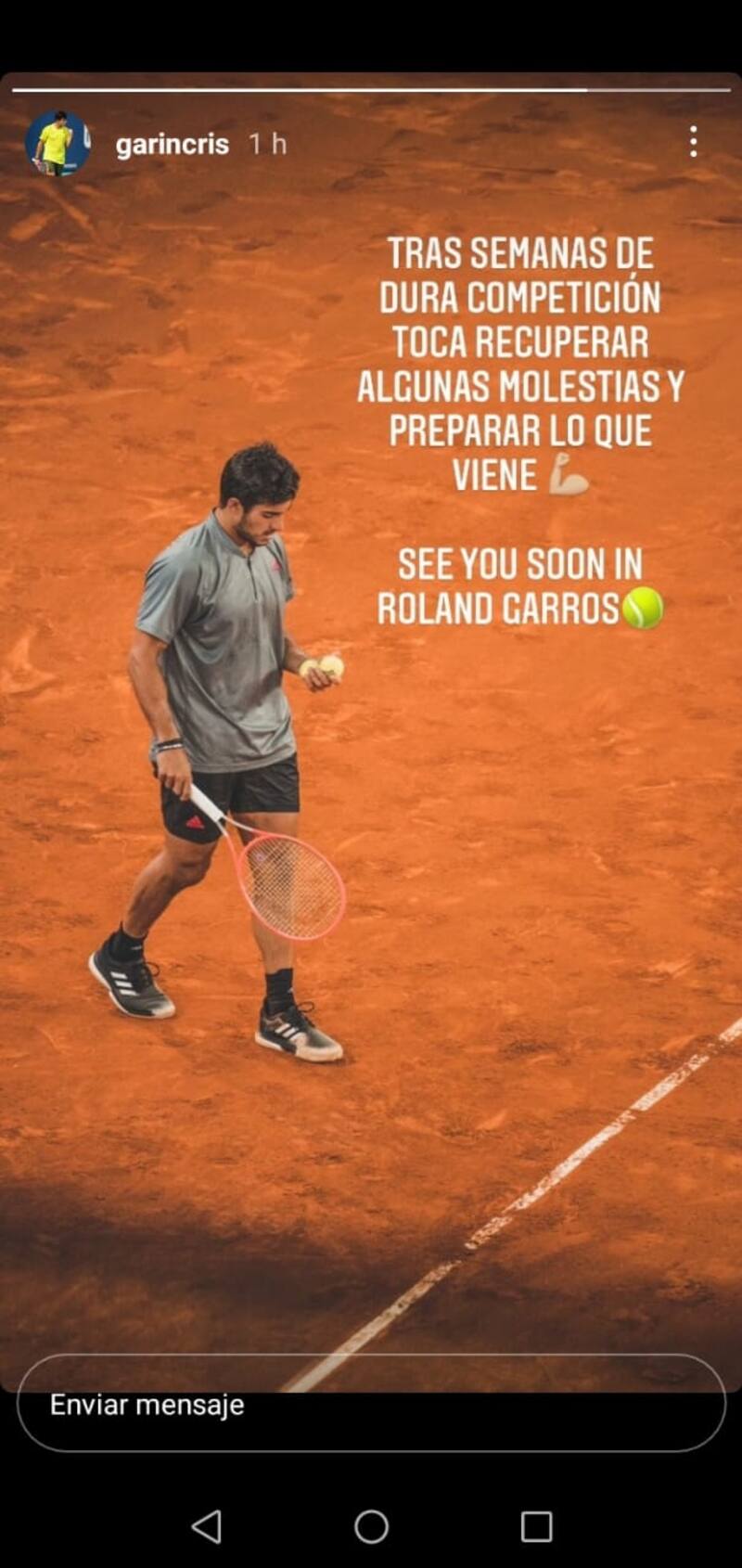 Tal como lo publicó en el mensaje en Instagram, la nueva meta de Garin para retomar la competencia es el torneo francés de Roland Garros. El torneo está programado para que se dispute entre el 24 de mayo y el 13 de junio.