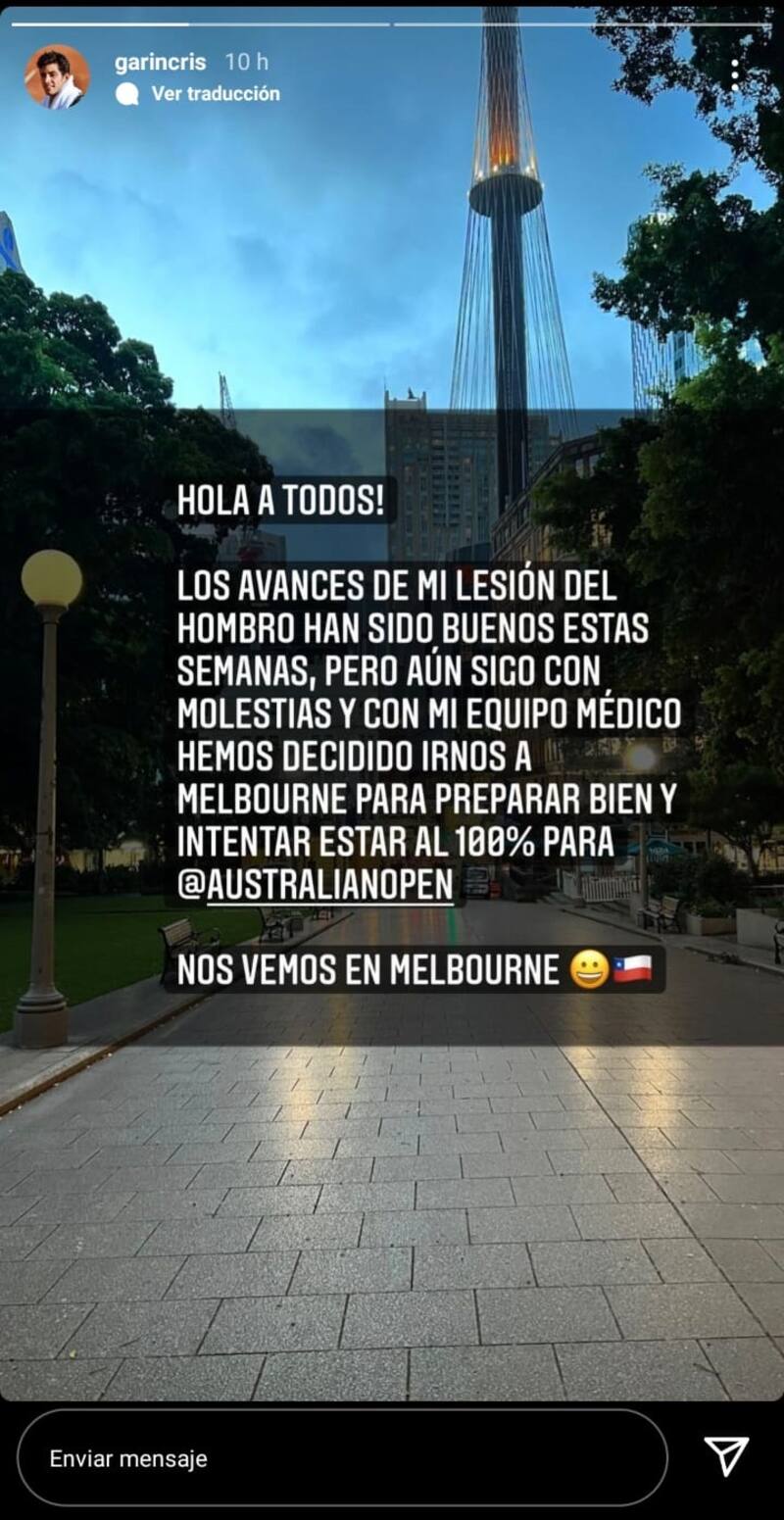 “Los avances de mi lesión del hombro han sido buenos estas semanas, pero aún sigo con molestias y con mi equipo médico hemos decidido irnos a Melbourne para preparar bien e intentar estar al 100% para el Australia Open...”. Con ese mensaje, a través de su Instagram, Christian Garín anunció que no participará del ATP 250 de Sidney, que se disputará entre el 10 y 15 de enero.