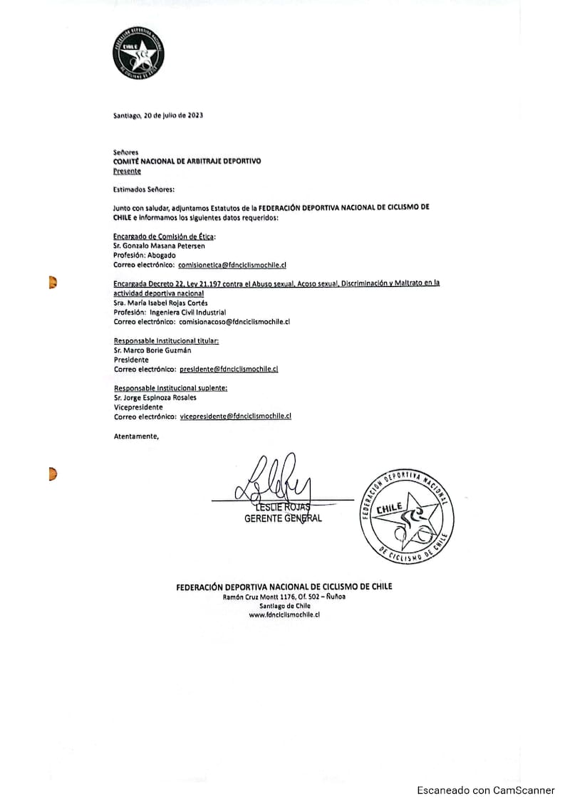 Este medio consiguió, a través de una solicitud formal al CNAD (Comité Nacional de Arbitraje Deportivo), un documento firmado por la gerenta general de la federación de ciclismo, en el que se especifica que el responsable institucional es Marco Borie Guzmán, presidente de la federación de ciclismo nacional. Una situación insólita, ya que, en otras palabras, es como si el mismo denunciado debiese investigar una acusación en su contra.
