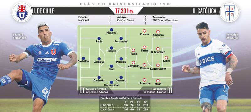 Por un lado, Universidad de Chile y una opción para consolidar su posición dominante en el Campeonato Nacional, donde es el líder y principal candidato a la corona. Por el otro, Universidad Católica y una oportunidad para reafirmar el alza sostenida que trae de la mano de Tiago Nunes. El Estadio Nacional recibe la versión 198 del Clásico Universitario, el partido más tradicional del fútbol criollo.
