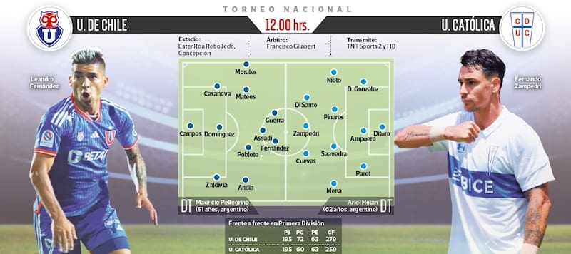 Universidad de Chile recibe al mediodía a la UC, en Concepción. Un triunfo les permitirá a los azules quedar solos en la punta. Mientras los de Mauricio Pellegrino llegan en un buen momento, los dirigidos por Ariel Holan vienen de cuatro partidos sin ganar y con muchas bajas de jugadores por lesión.
