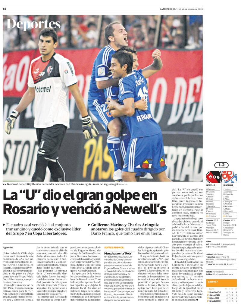 El tercer partido era en Rosario. Debían visitar al poderoso equipo de Gerardo Martino en el estadio Marcelo Bielsa. A la postre, el cuadro leproso fue semifinalista de esa versión del torneo. Sin embargo, ese día, la U de Darío Franco dio la sorpresa. Se impuso por 2-1 en Argentina, con goles Gerardo Martino (3′) y Charles Aránguiz (16′). Más tarde descontó Ignacio Scocco (45′). En el segundo tiempo, el equipo nacional defendió la ventaja y se llevó los tres puntos. De ese equipo se repite solo el Príncipe, que volvió a la U el año pasado.