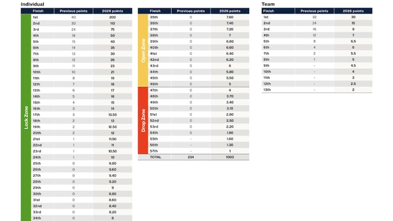 “La temporada 2026 introduce un nuevo sistema de puntos que aumenta la cantidad total de puntos distribuidos, otorga puntos a todos los finalistas y prioriza a los mejores. La estructura revisada está diseñada para reflejar mejor el rendimiento constante y de alto nivel a lo largo de la temporada, a la vez que reconoce la importancia de las contribuciones individuales a los resultados del equipo cada semana”, detallan las bases del certamen.
