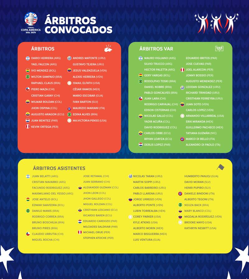 La Confederación Sudamericana de Fútbol dio a conocer la nómina de 101 jueces convocados para el torneo, donde se destaca la presencia femenina. La representación chilena también incluye a Cristián Garay, más asistentes y encargados del VAR.