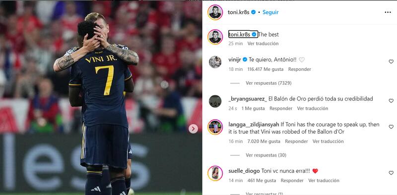 Toni Kroos fue uno de los que se cuadró con Vini. “El mejor”, posteó en Instagram, acompañado de un abrazo entre ambos. Esa manifestación de aprecio fue la que produjo la única reacción que se ha conocido del brasileño durante el día. “Te quiero, Antonio”, contestó el brasileño, acompañado de un corazón blanco que, en lenguaje cibernético denota amistad.