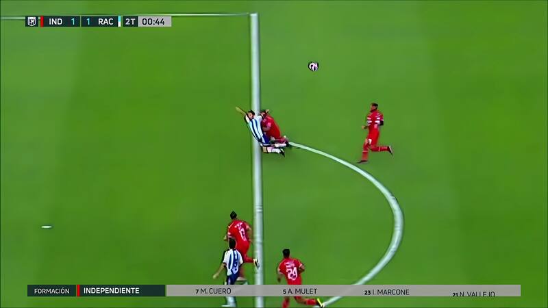 Luego, vino la acción más polémica de la tarde: el penal que se le cobra a favor a Racing. El juez Yael Falcón Pérez cobra la pena máxima por una infracción de Vallejo a Mura. La falta existe, sin embargo lo que reclama Independiente es que fue afuera del área. El árbitro no revisó la acción en el VAR. Falcón Pérez fue recriminado al final del juego por los integrantes del equipo local. “Me confirman que lo terminó empujando adentro. ¿Los árbitros tenemos culpa de todo, ustedes no tienen culpa de nada, no?”, contestó el referí.