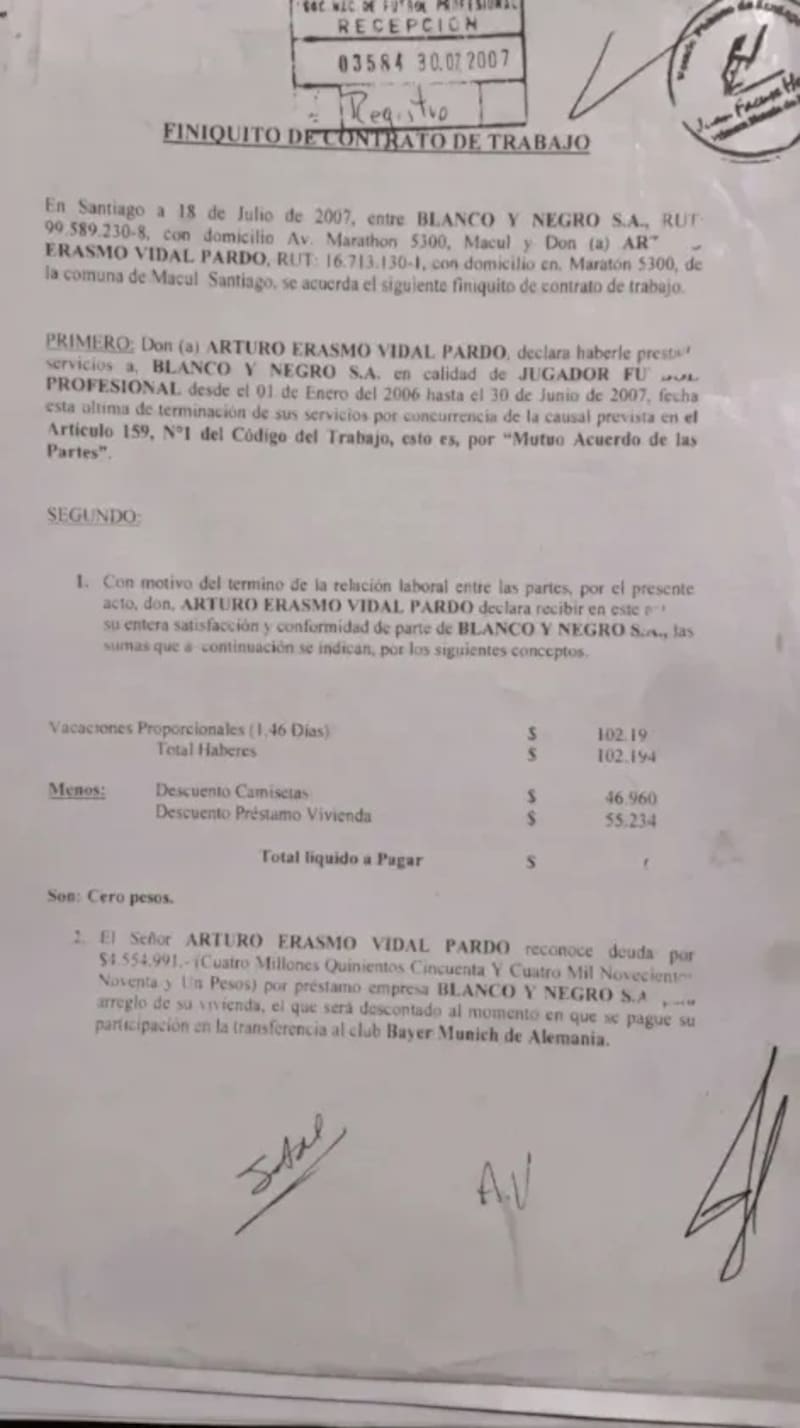 El documento, con fecha del 18 de julio de 2007, y que fue compartido por la cuenta de Instagram Museo 19 de abril, indica que “don Arturo Erasmo Vidal Pardo declara haberle prestado servicios a Blanco y Negro SA en calidad de jugador de fútbol profesional desde el 1 de enero de 2006 hasta el 30 de junio de 2007″.