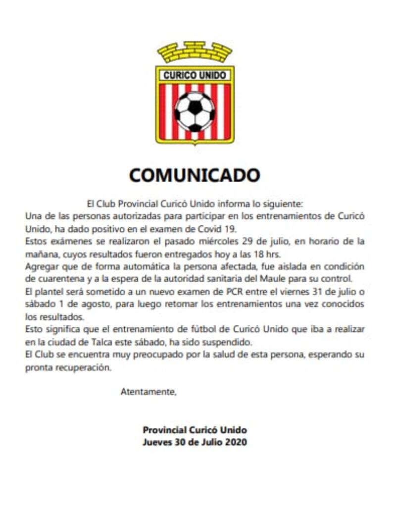 Tal como más temprano había sucedido con Colo Colo, que informaba de un caso positivo por Coronavirus, por la noche fue el turno de Curicó Unido de hacer público que también una persona que está autorizado para asistir a los entrenamientos del club maulino se había contagiado del mal.