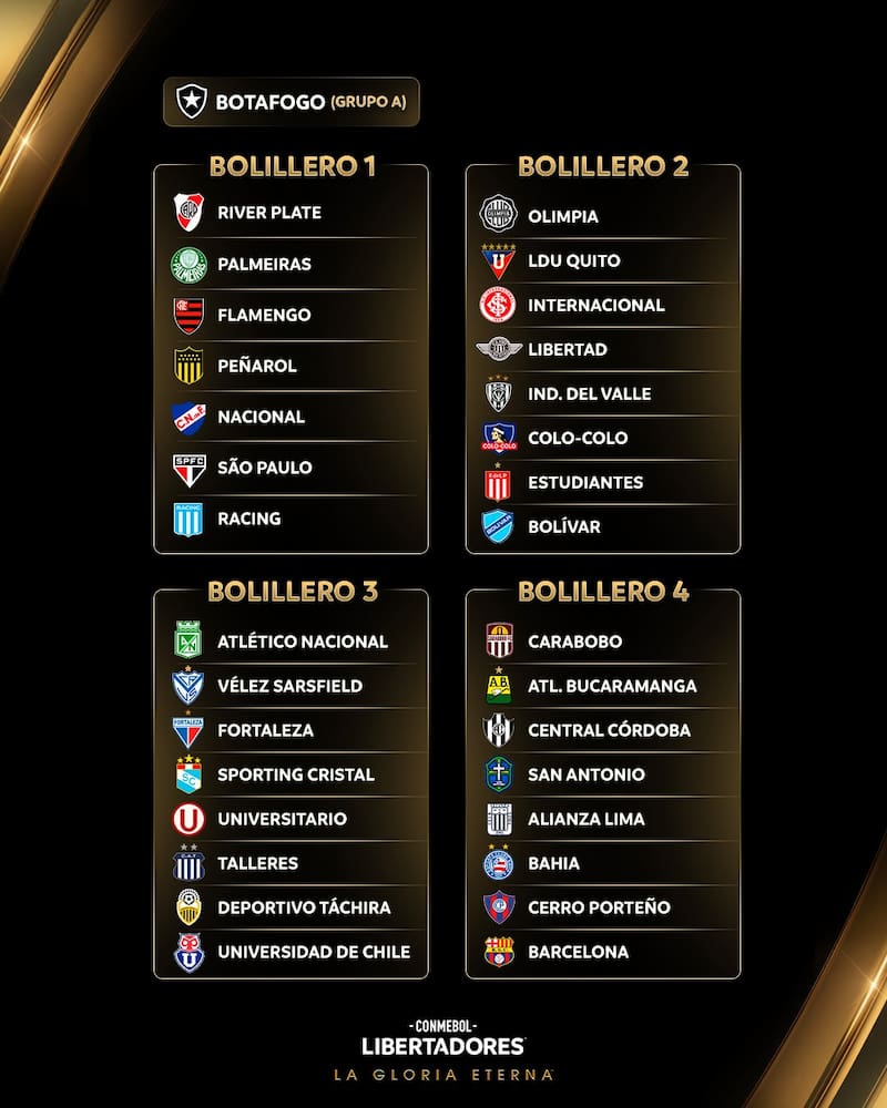 Lo único claro es que el campeón vigente, Botafogo, será colocado directamente como cabeza de serie de la zona A. Los otros que se ubican en el bolillero 1 son River Plate, Palmeiras, Flamengo, Peñarol, Nacional, Sao Paulo y Racing.