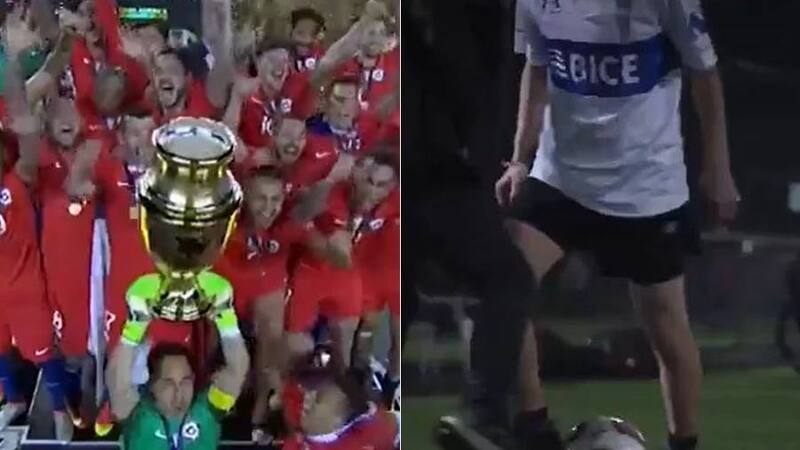 Mientras el edil expone su postura, se aprecia entre las imágenes de apoyo la aparición de una persona utilizando la camiseta de la UC en una cancha de futbolito y más adelante aparece una imagen de Claudio Bravo levantando la Copa América.