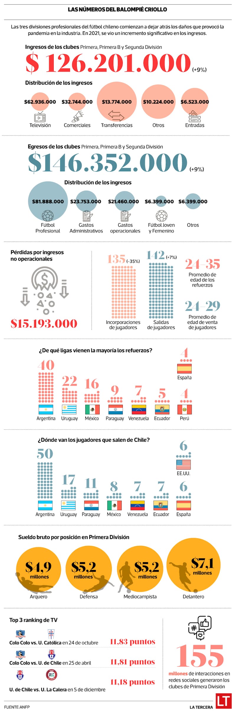 El fútbol mueve millones. De sentimientos, de hinchas y, por cierto, de pesos. De los últimos, pocas veces se conoce con exactitud el destino. Cómo se distribuyen y quienes se lo llevan. O las diferencias que hay entre las distintas categorías e incluso entre los jugadores que ocupan las distintas demarcaciones en el campo de juego. Varias de esas interrogantes quedan despejadas en la quinta edición del anuario financiero del balompié chileno, que resume la temporada 2021. Se trata de una mirada profunda a la industria, que revela sus fortalezas, pero que también pone en evidencia sus debilidades. Una introspección que, incluso, permite situar a la actividad deportiva que más cautiva a los chilenos en el escenario más global. Y, a partir de esas diferencias, concluir por qué hace rato que las escuadras nacionales no consiguen participaciones destacadas en el contexto sudamericano.
