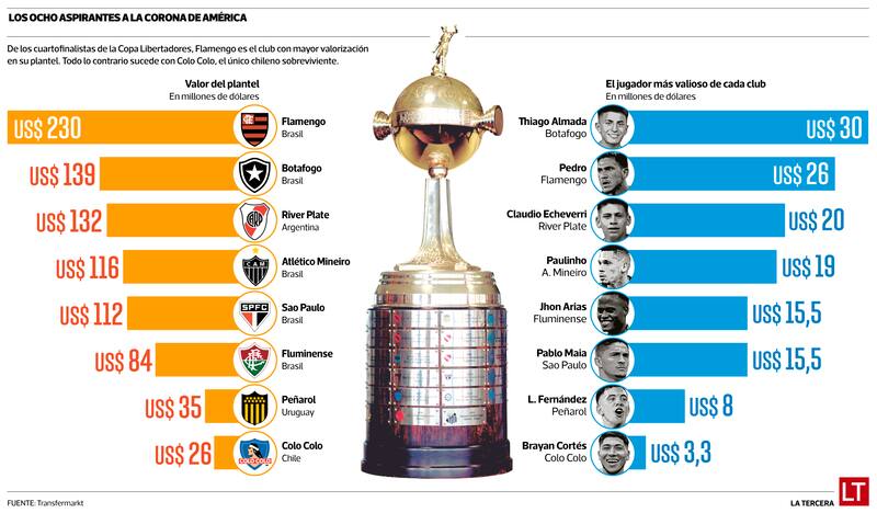 De los cuartofinalistas, el único que supera la barrera de los US$ 200 millones es el Flamengo. El Mengao es, precisamente, el más valioso con una plantilla de US$ 230 millones. Entonces, el plantel de Colo Colo equivale a solo el 11% del Fla, que enfrentará a Peñarol por el pase a las semifinales.