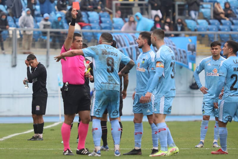 A los 45+5′, el atacante fue expulsado por un codazo de Juan Pablo Gómez. Tras varios minutos de pausa en el juego y ante la alarma por el lateral derecho que seguía en el suelo, el árbitro Benjamín Saravia fue a revisar el VAR y dejó con diez jugadores a los celestes.