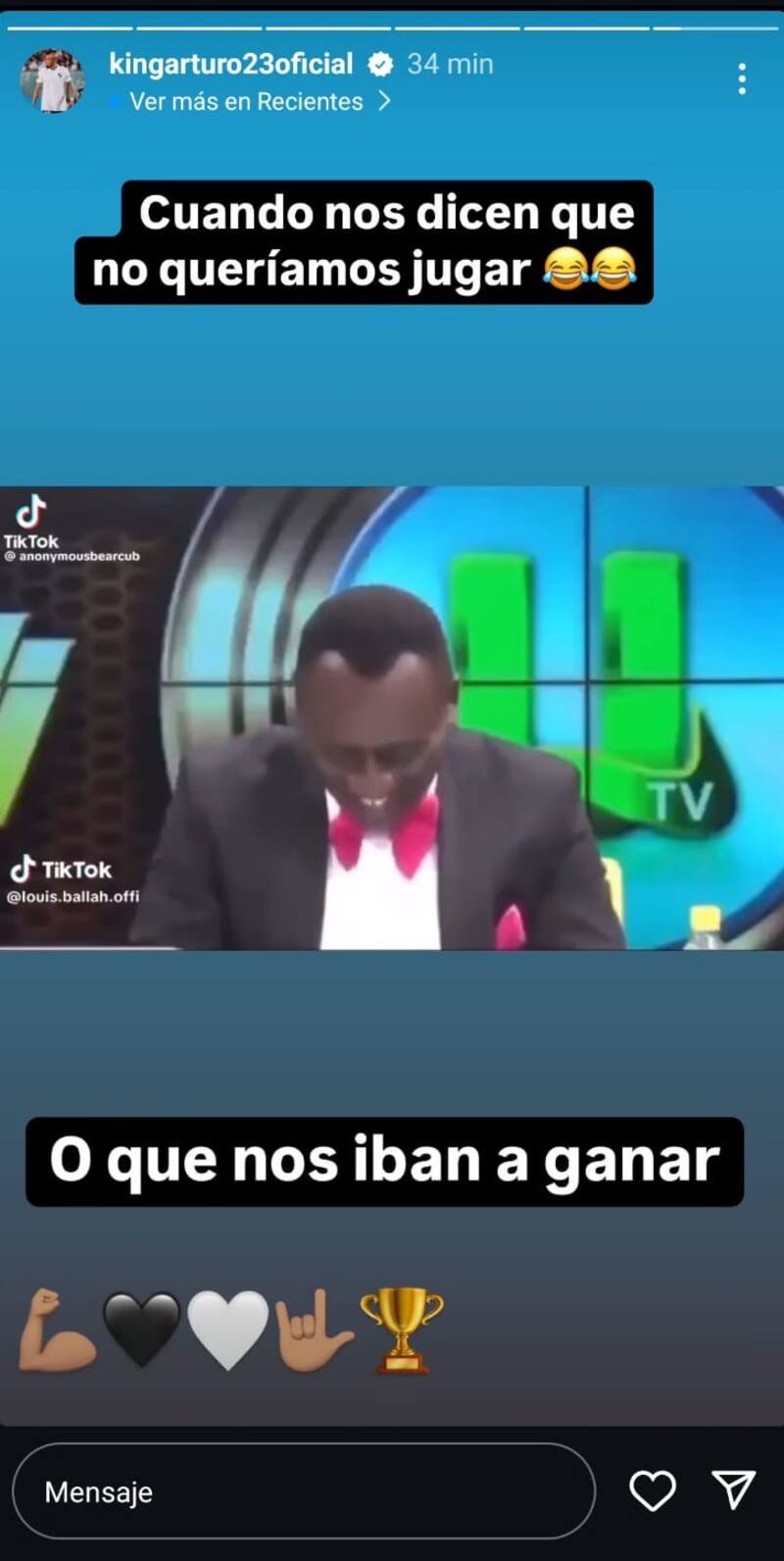 “Cuando nos dicen que no queríamos jugar. O que nos iban a ganar”, escribió en Instagram el volante, acompañando el texto con un video donde se ve a un actor riendo y algunos emojis aludiendo a un chiste.