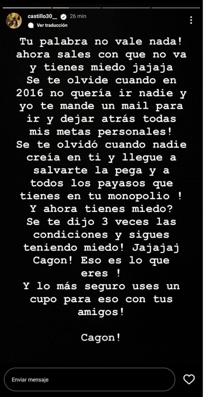 “Se te olvida cuando en 2016 no quería ir nadie y yo te mandé un mail para ir y dejar atrás mis metas personales. Se te olvidó cuando nadie creía en ti y llegué para salvarte la pega y a los payasos que tienes en tu monopolio”, expresa. Fue en el año que indica Castillo que se dio su retorno a la precordillera.
