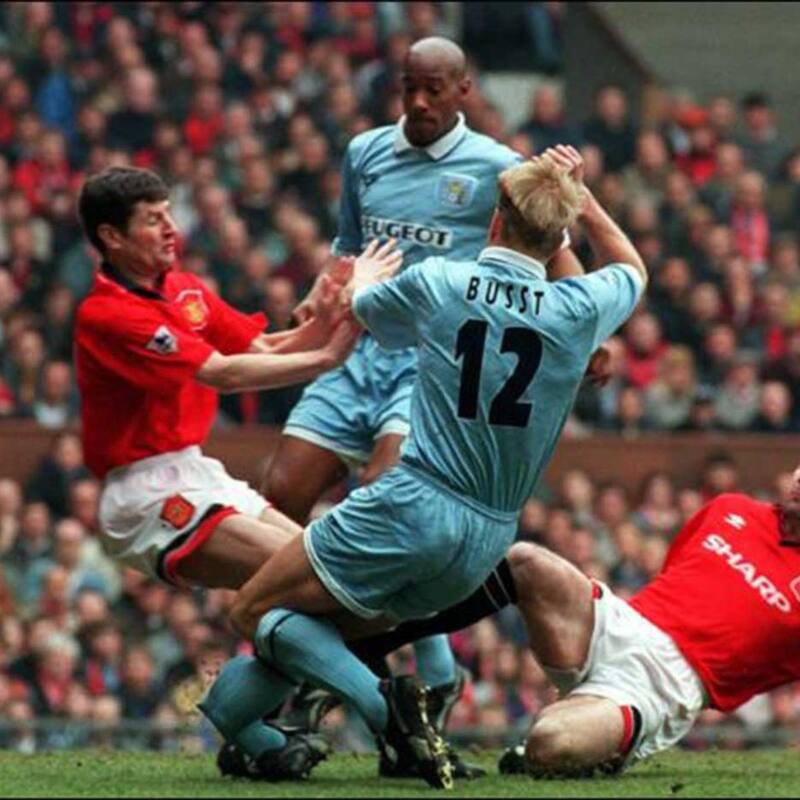 Necesitó 26 operaciones para poder recuperarse de esta terrible experiencia. El duelo entre el Manchester United y el Coventry City el 8 de abril de 1996, en Old Trafford, quedó grabado en la historia del fútbol inglés. David Busst, que en ese entonces defendía los colores del Coventry, se estira para tratar de convertir en gol un rebote que había dado en el área el portero local Peter Schmeichel, pero los defensores Dennis Irwin y Bryan Mc Clair, en su intento por despejar, impactan con dureza la pierna de Busst. Fue una entrada doble. Ambos planteles quedaron consternados, no lo podían creer. Schmeichel hasta terminó vomitando en el campo.