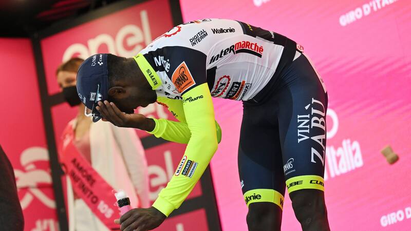Girmay se baja de la undécima etapa del Giro de Italia tras lesionarse un ojo al descorchar el champán del podio