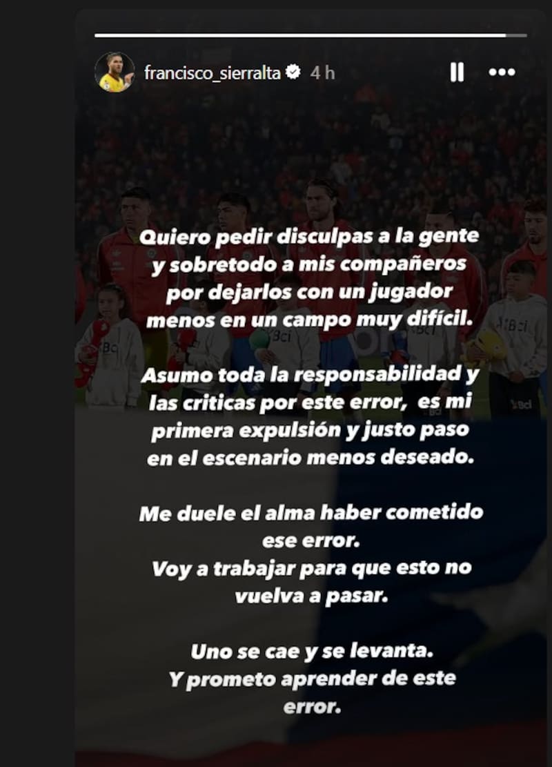 El defensa sabe que cometió un serio error. Y ofrece disculpas. “A la gente y, sobre todo, a mis compañeros, por dejarlos con jugador menos en un campo muy difícil”, sostiene en la historia que publicó en su cuenta en Instagram.