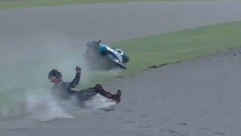 Fue en la curva 14, en el final del tercer libre, donde Quartararo cayó de su moto y se golpeó la zona izquierda de la cadera. Quejándose del dolor, tuvo que salir en camilla para ser revisado por el personal médico de la competencia. No obstante, luego de ser evaluado, se descartaron lesiones graves (tuvo un hematoma) y pudo correr en la qualy. Pasó de estar en duda a ser el más veloz en la pista de MotorLand.