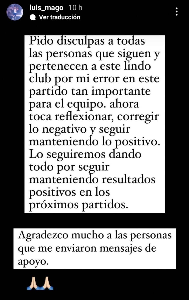 “Pido disculpas a todas las personas que siguen y pertenecen a este lindo club por mi error en este partido tan importante para el equipo”, indicó Luis Del Pino Mago en su cuenta oficial de Instagram.